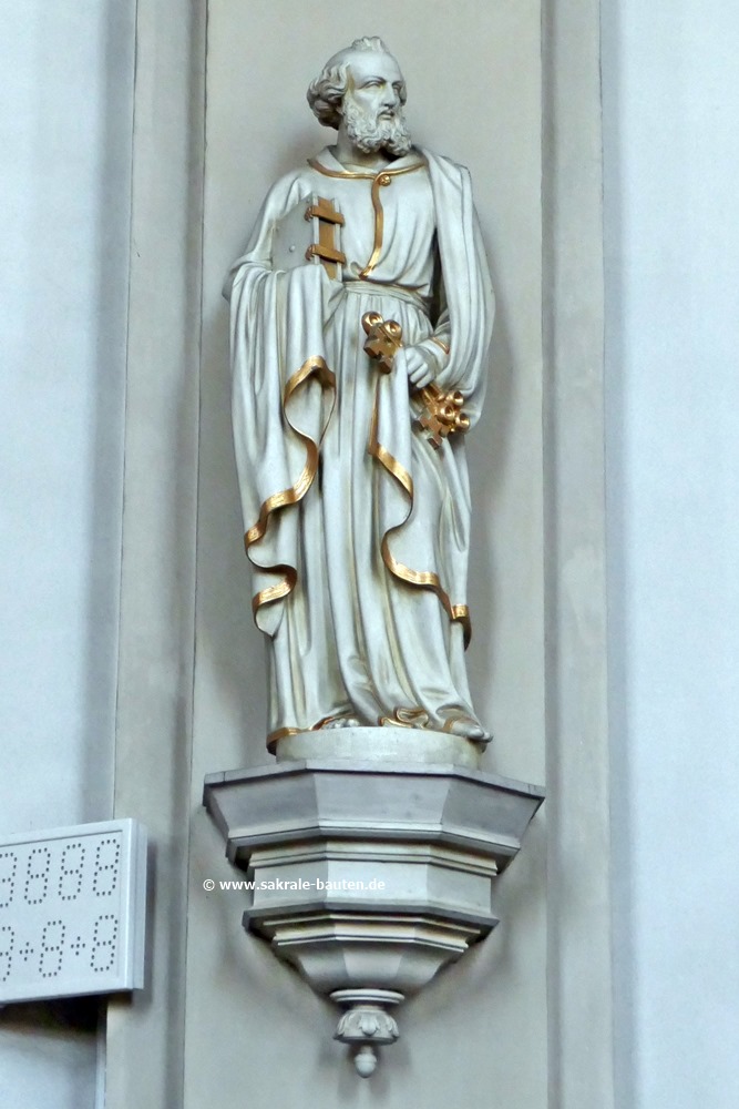 Im Giebelfeld des Hochaltars über dem Bild ist eine Figur des Namenspatrons der Kirche, des hl. Nikolaus angebracht.