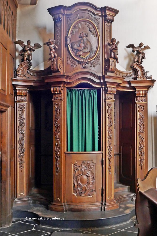 Bild 1: Die sechs Beichtstühle im Kirchenschiff sind feine Rokokoarbeiten. Vier mit Ranken verzierte Pilaster tragen auf Volutenkapitellen das Gesims und den Oberbau.