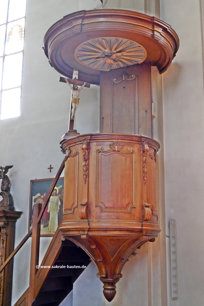 Bild 2: Rechts ist am dritten Langhauspilaster die schöne Rokokokanzel.