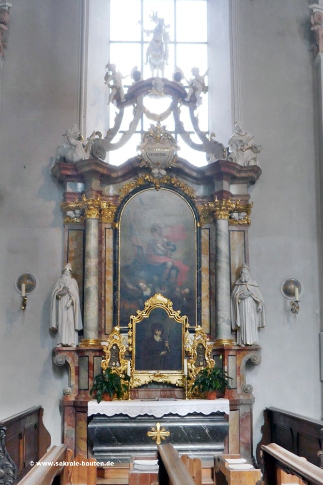 Das Altarbild zeigt den römischen Soldaten in voller Rüstung, wie er nach seinem Märtyrertod in den Himmel aufgenommen wird;
