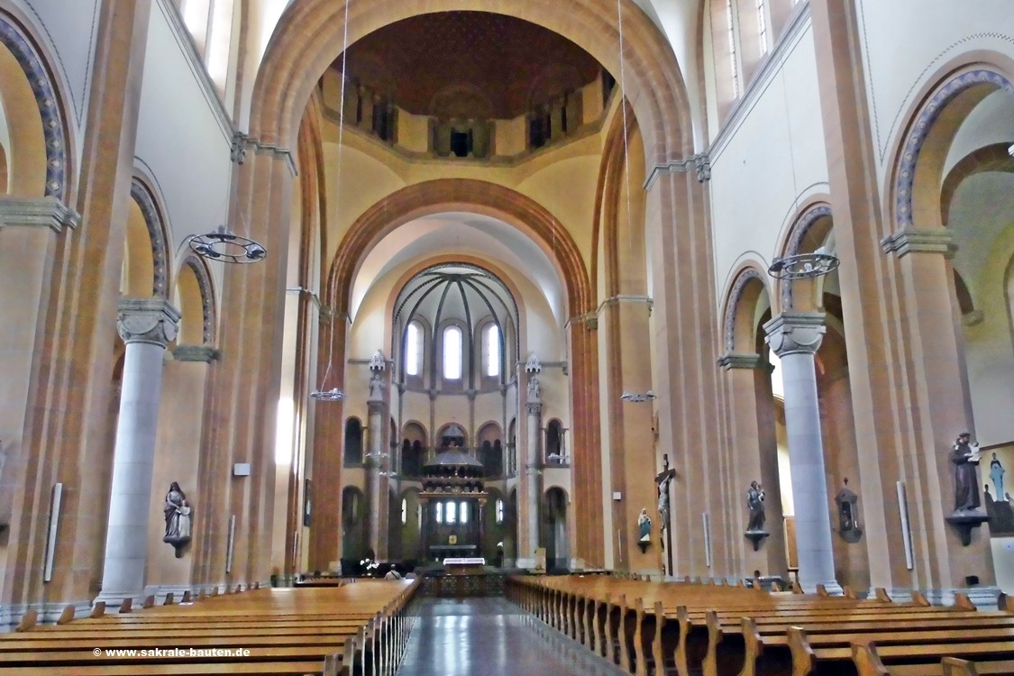 Im Vergleich zum monumentalen Äußeren der Kirche, zeigt sich ihr Innenraum überraschend schlicht. Blick durch das Kirchenschiff gegen den Hauptaltar.
