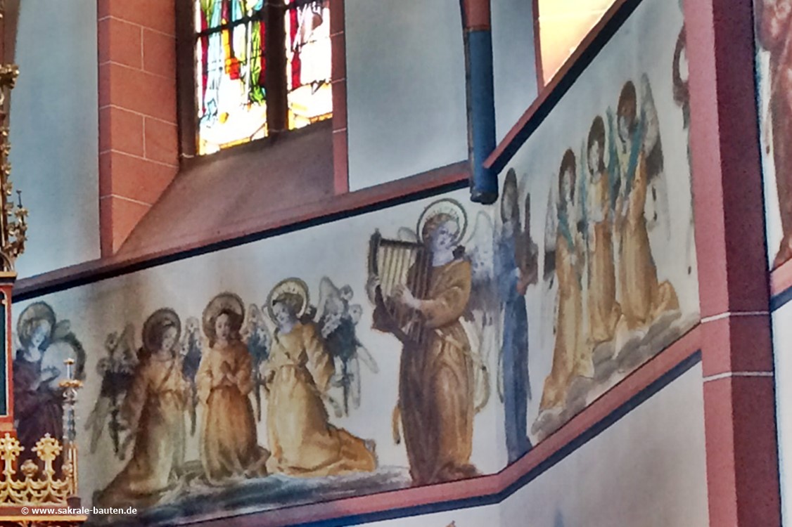 Die sechs großen und vier kleinen Engel der Chorbogenwand mit den Leidenswerkzeugen Jesu malte Franz Schilling.