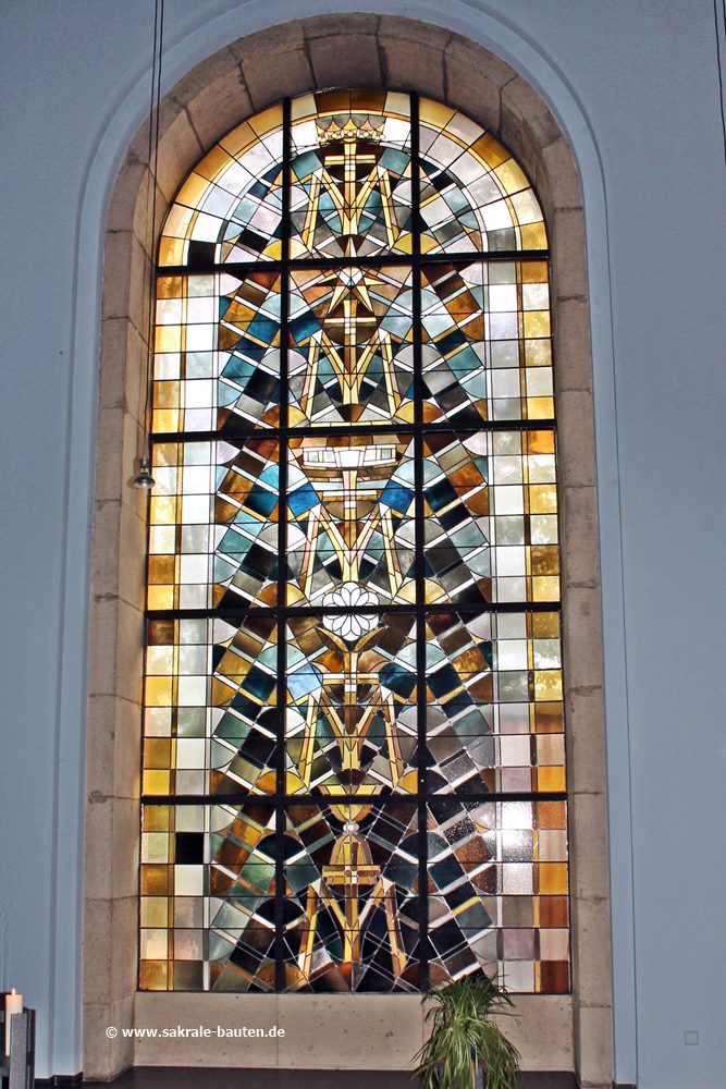 Bild oben 3: Fenster im Chor, Ornament mit Mariensymbolen. Josef Höttges, 1955.