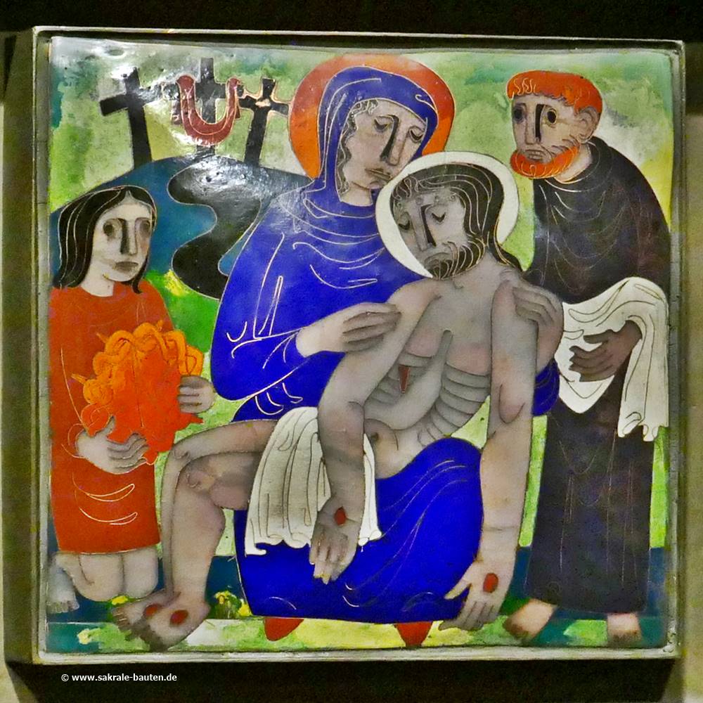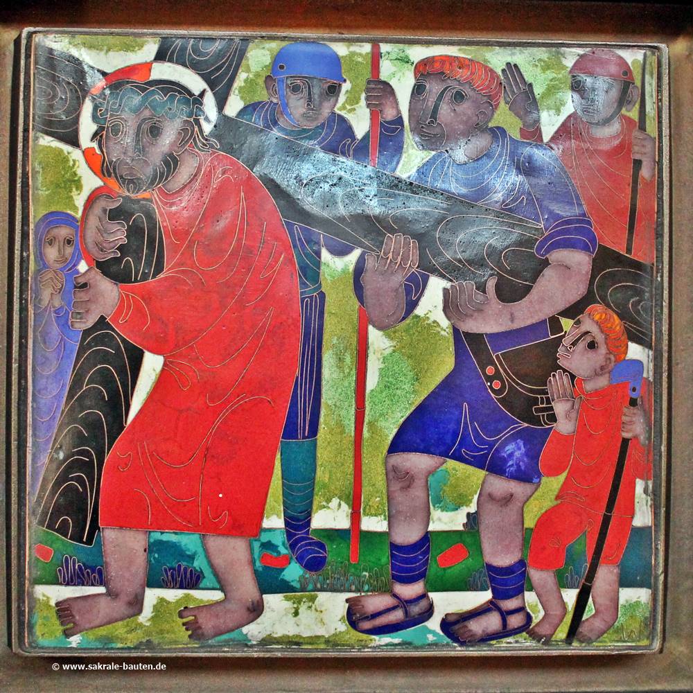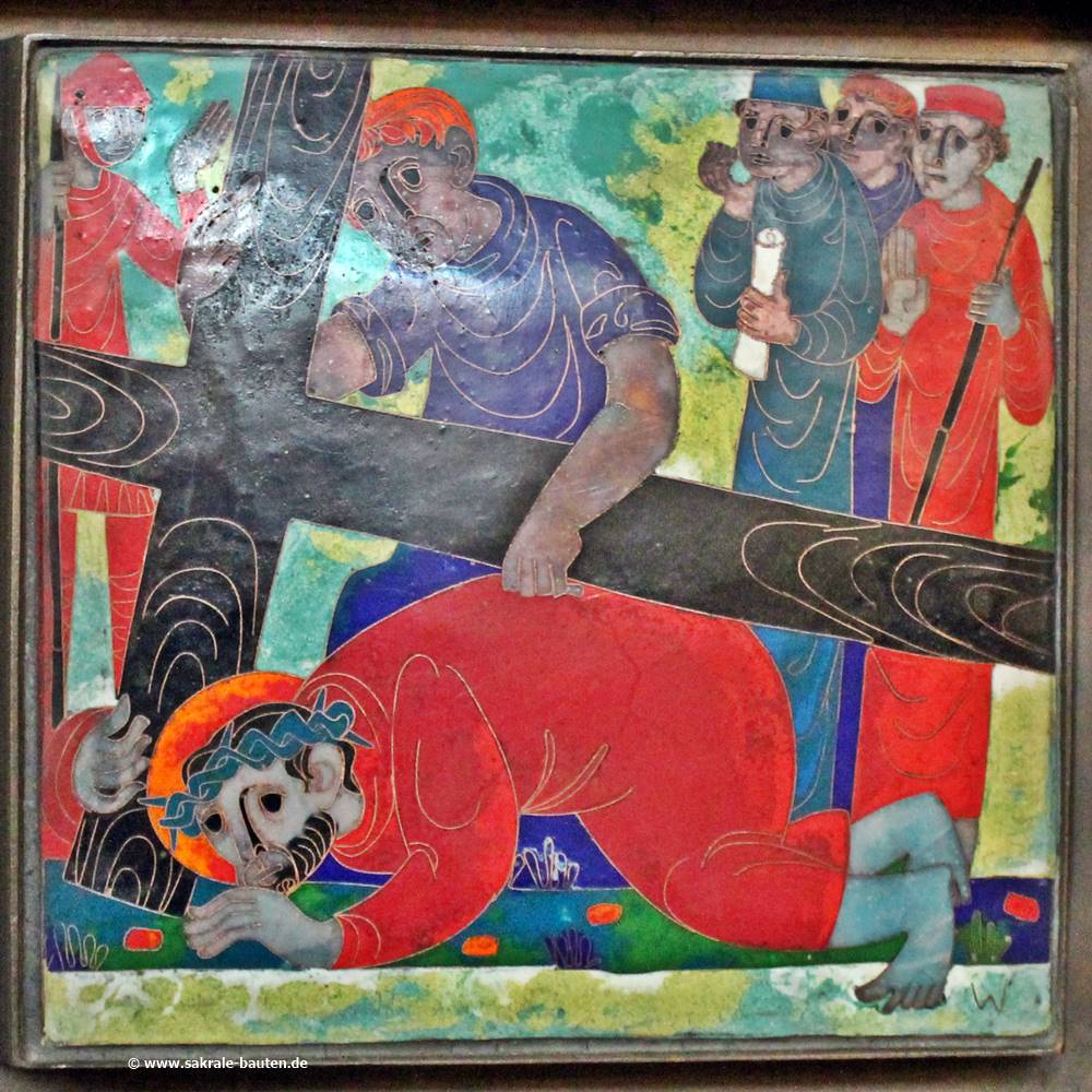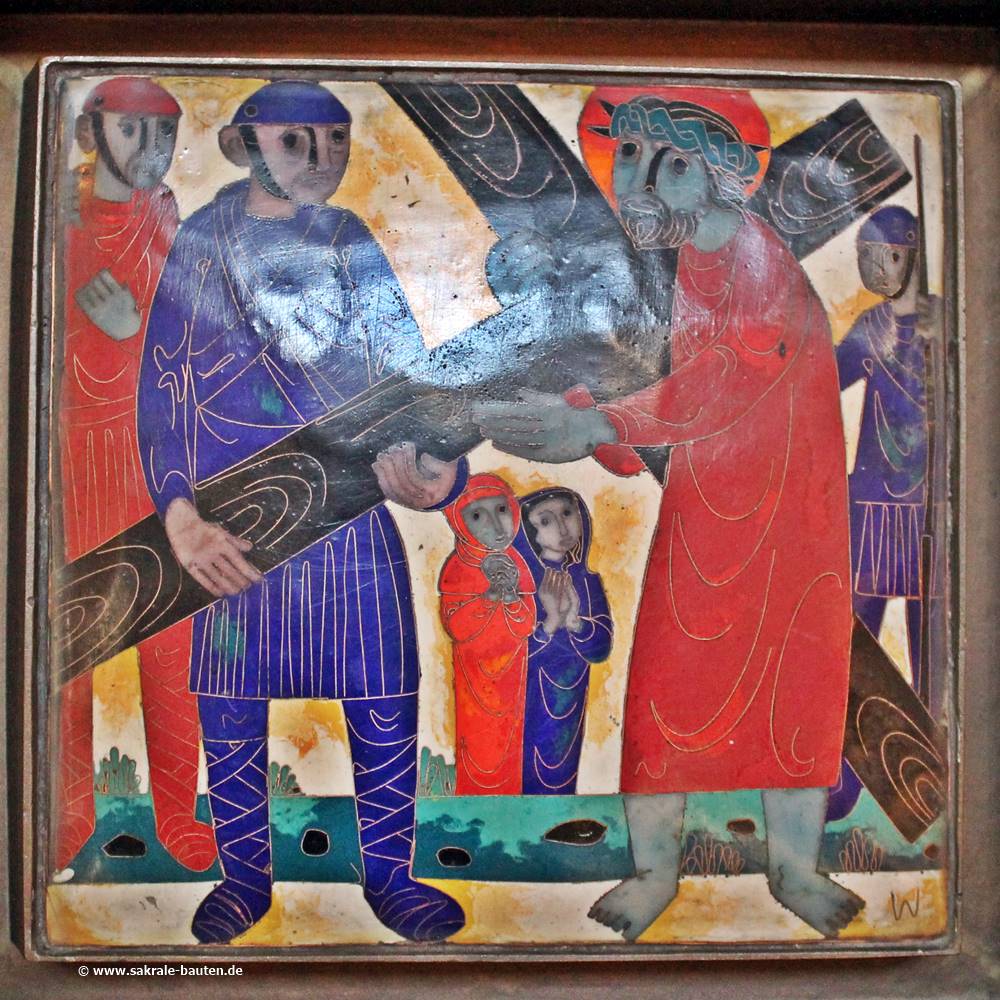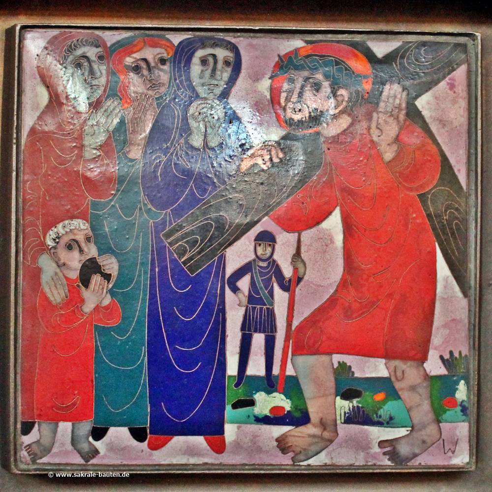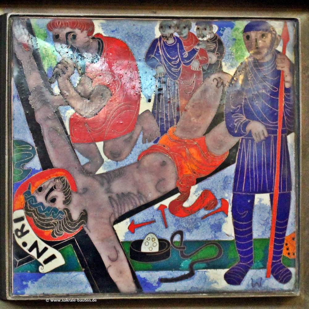 Im linken Seitenschiff, die 14 Kreuzwegstationen aus Emaille aus dem Jaht 1984 von Egino Weinert, Köln.