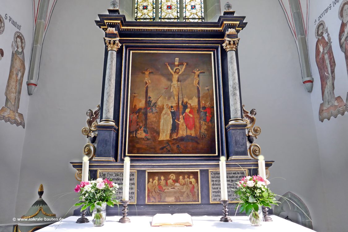 Das Kernstück des Altares ist eine Kreuzigungsgruppe, die auf Holz gemalt wurde. Auf diesem Gemälde ließ sich der Pfarrer Johann Conrad Draudius,