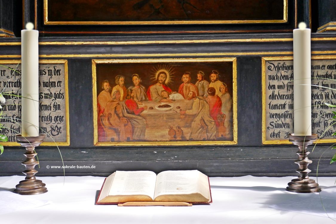 In der Predella wird das letzte Abendmahl dargestellt, es wird von den Einsetzungsworten begleitet.
