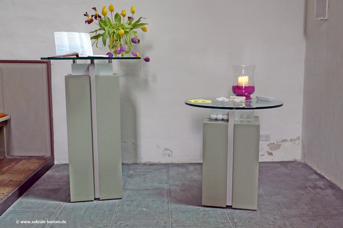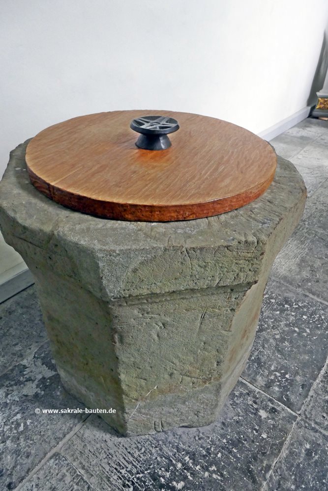 Das Taufbecken aus Stein ist achteckig, es stammt vermutlich aus der Vorgängerkapelle.