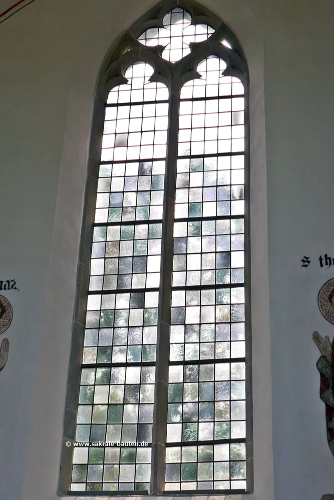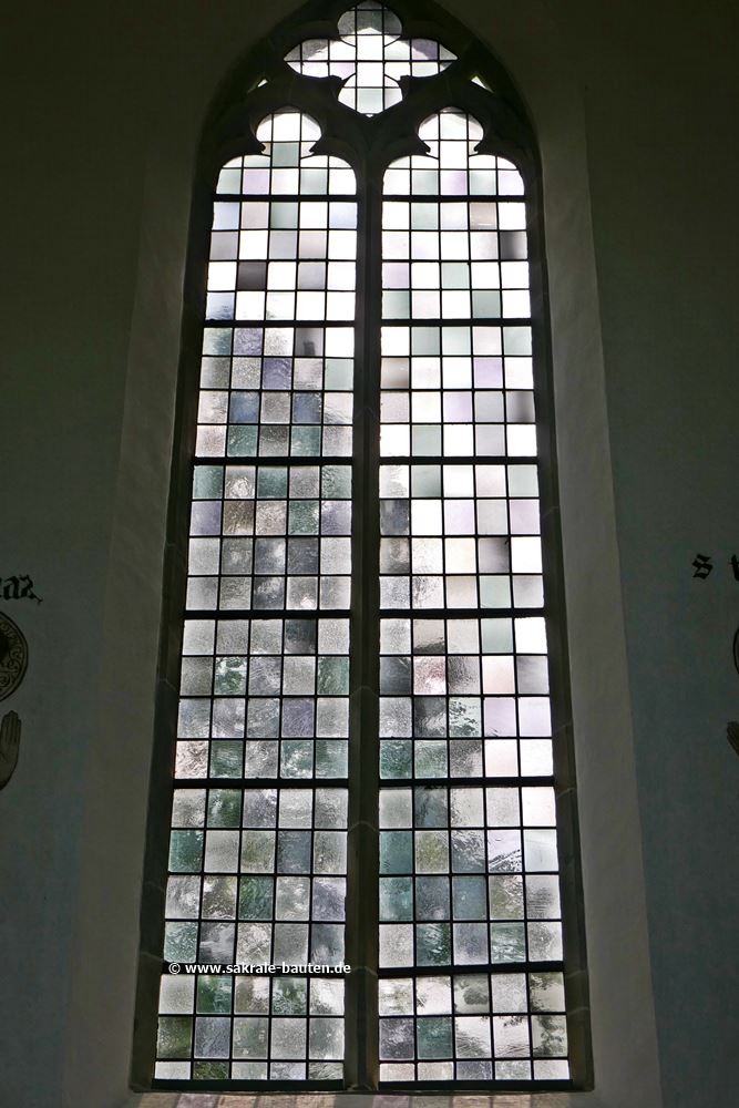 Bild 1: Fenster im Chor, Rechteckmuster mit Rahmenstreifen. Fa. Von der Forst, 1963.