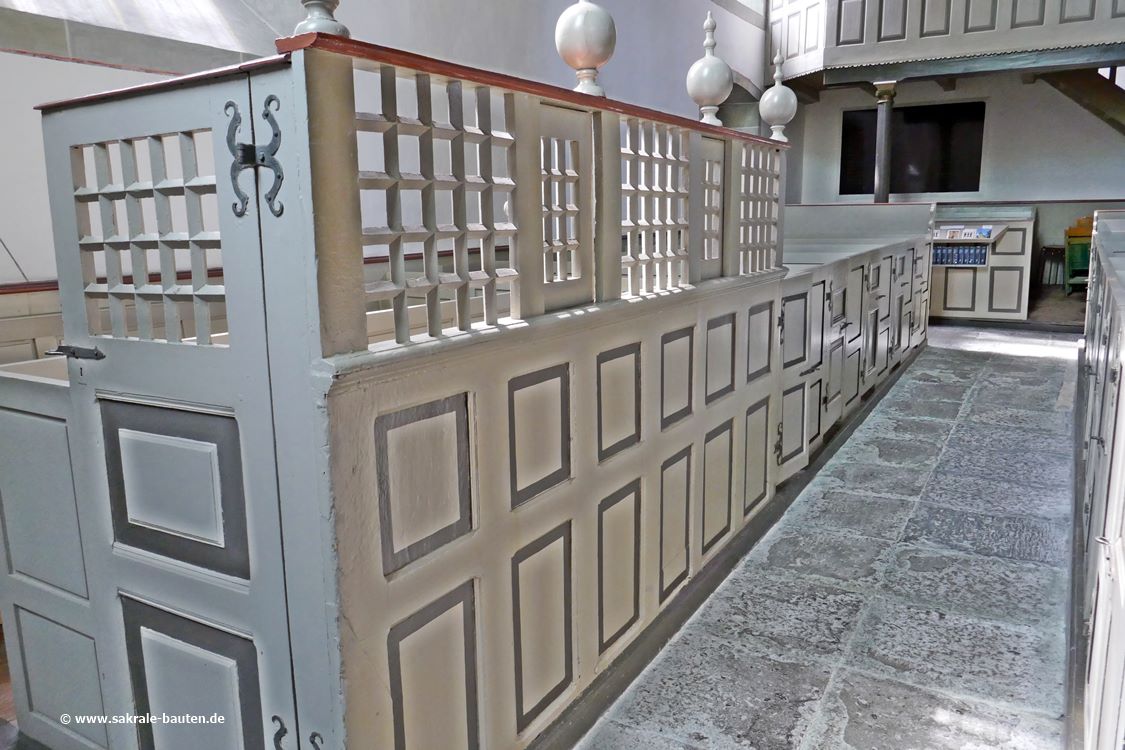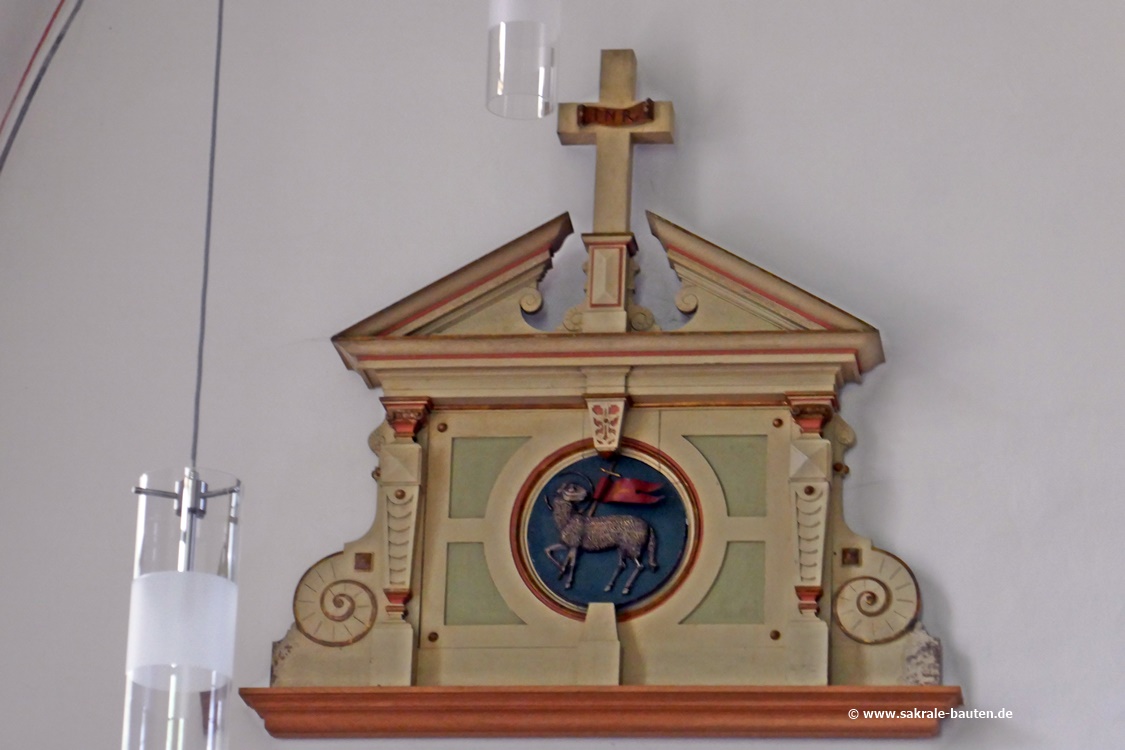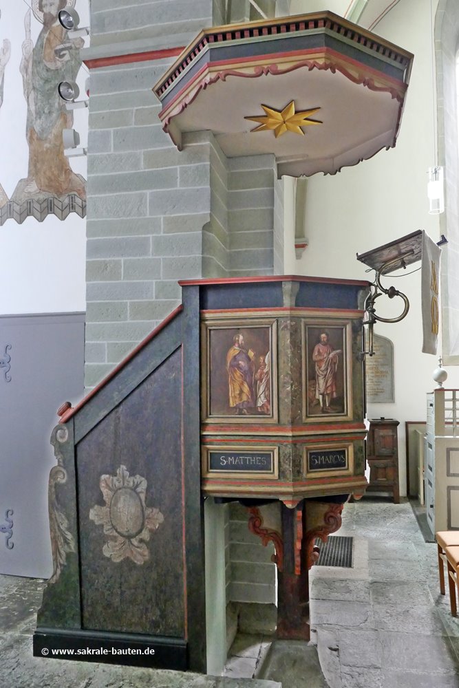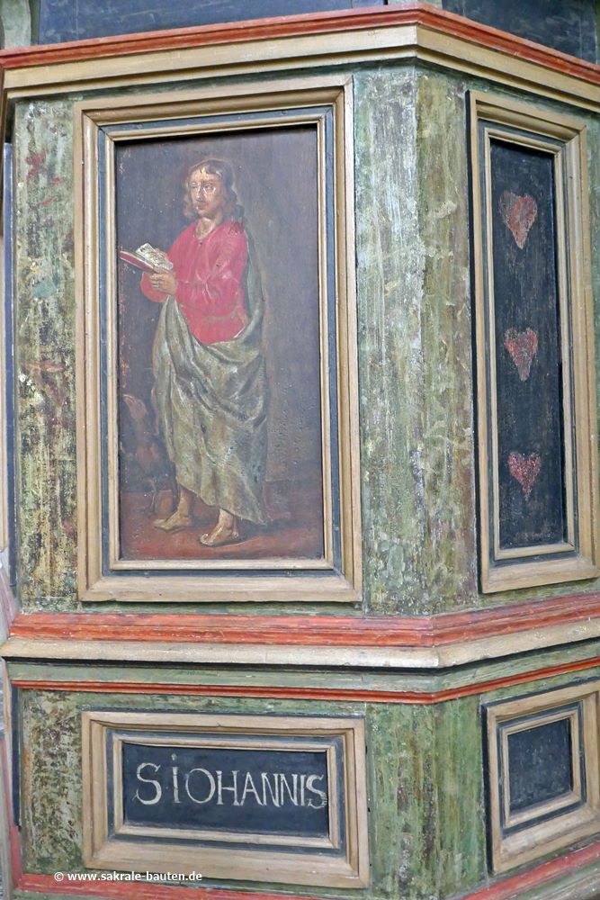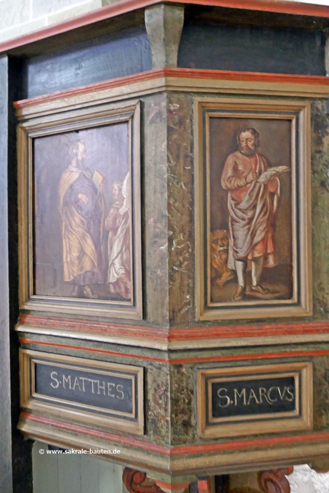 Der Kanzelkorb ist fünfseitig, auf den Füllungen im Mittelteil sind die vier Evangelisten mit ihren zugehörigen Symbolen dargestellt.