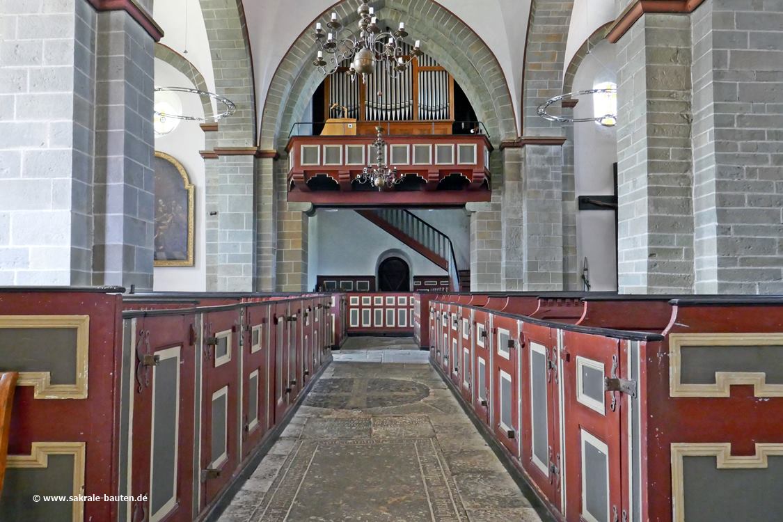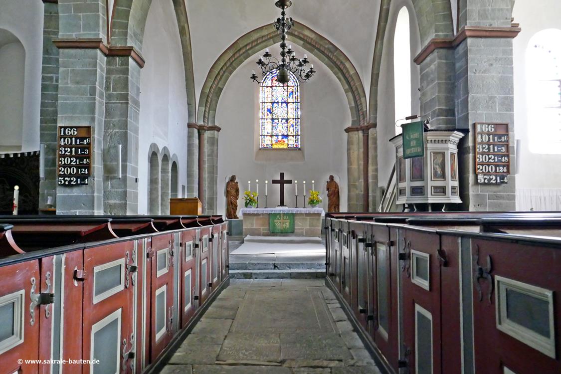 St. Pantaleon ist eine dreischiffige, zweijochige Hallenkirche mit gerade abgeschlossenem Chor.