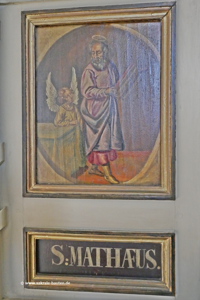 der Kanzelkorb ist in fünf Felder unterteilt und zeigt in den Füllungen Tafelbilder mit den Darstellungen der vier Evangelisten und ihrer Symbole.