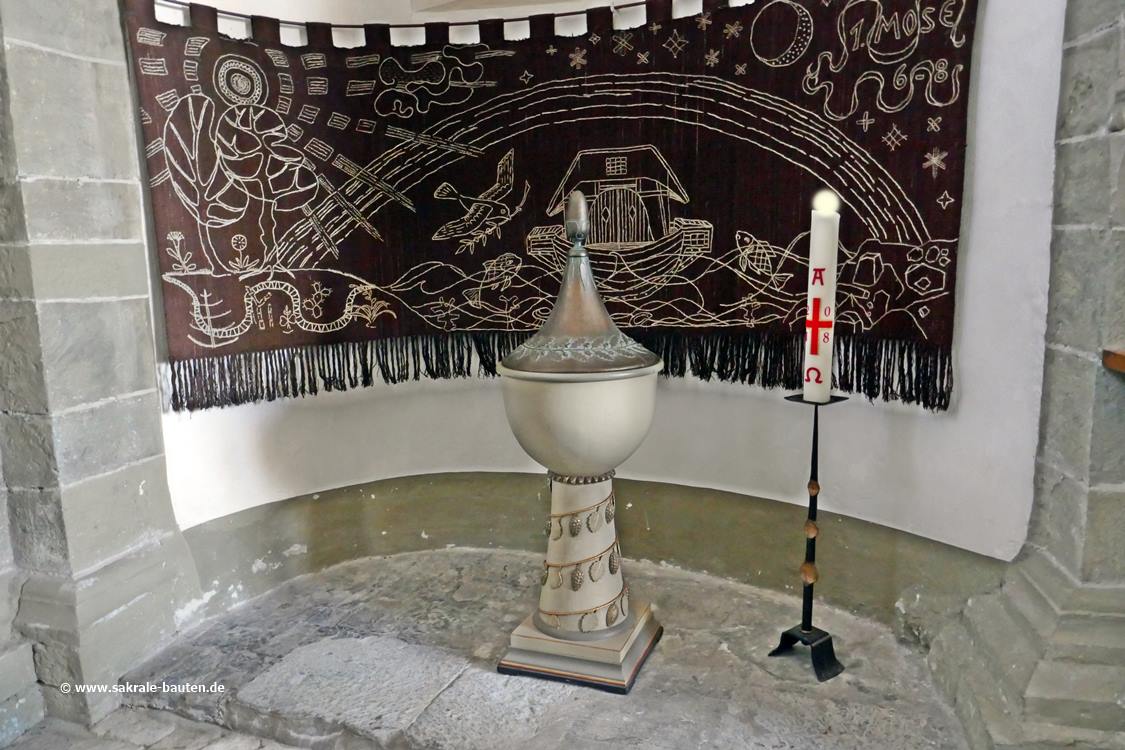 Bild 2: Ein Wandbehang mit der Darstellung der Bewahrung Noahs kleidet die Taufnische aus. Eine Taube, die einen Ölzweig zur Arche bringt, symbolisiert das Ende der Sintflut.