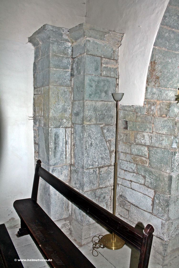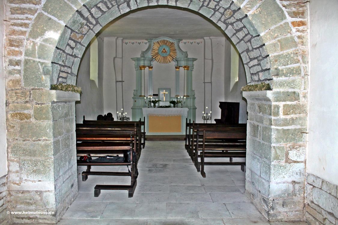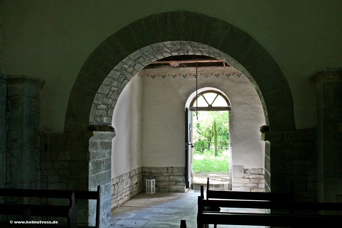 Der Westturm ist durch ein schlichtes Rundbogenportal erschlossen; die Glocke im Turm wurde um 1200 gegossen.