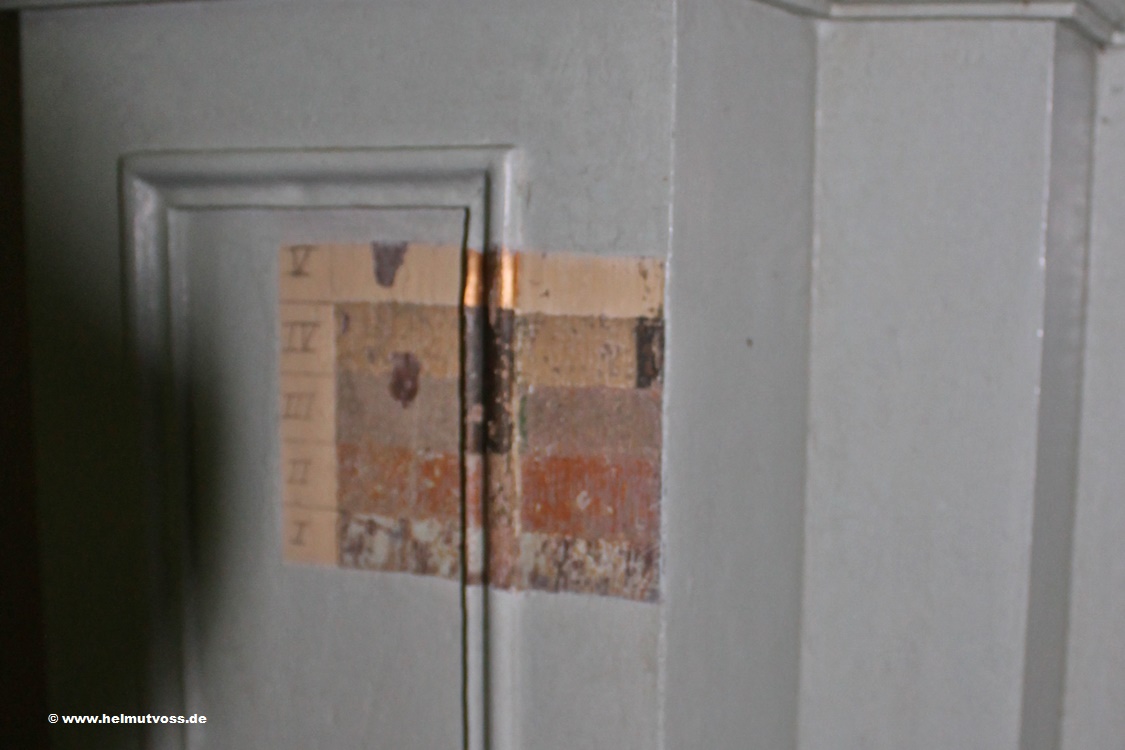 Bild 3. Die Originalbefunde, die bei Restaurierungsarbeiten freigelegt wurden, hier sieht man das der Altar im Laufe der Zeit mehrmals mit verschiedenen Farben bemalt wurde.