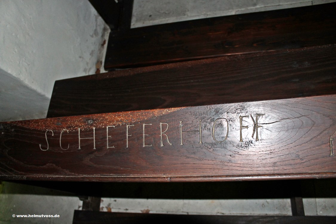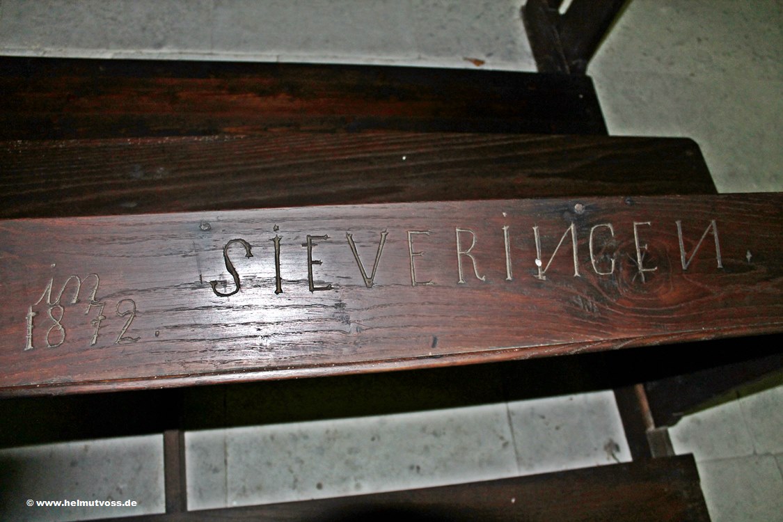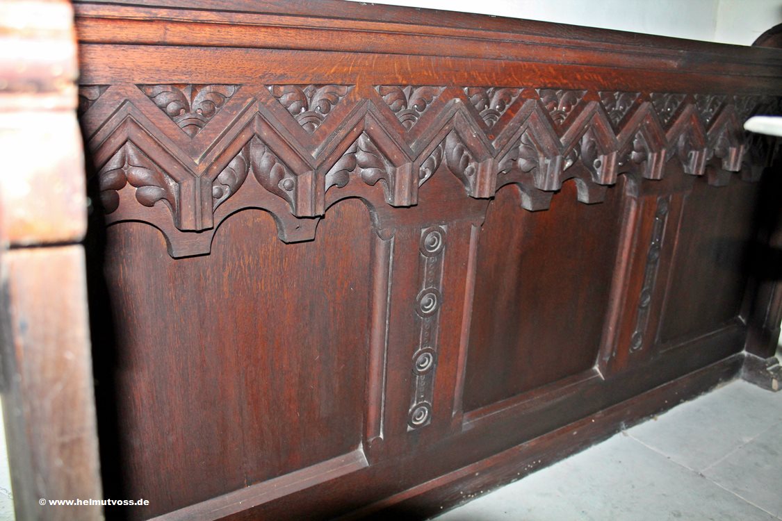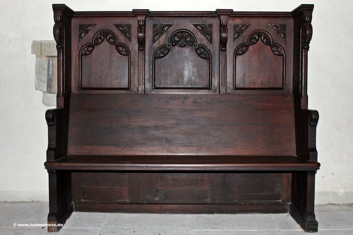 Hier neben dem Altar eine Antike alte Kirchenbank, eine Gebetsbank mit Schnitzereien aus Eiche. Die Kapellenbänke stammen aus der Zeit um 1860.