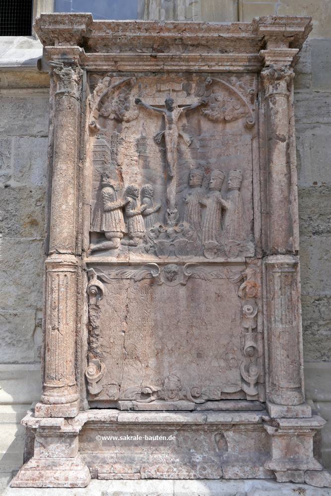 Bild 1: Lackner-Epitaph mit Ölbergmotiv (Sandsteinrelief mit spätgotischer Umrahmung) und Grabsteine der Ratsbürgerfamilie Lackner