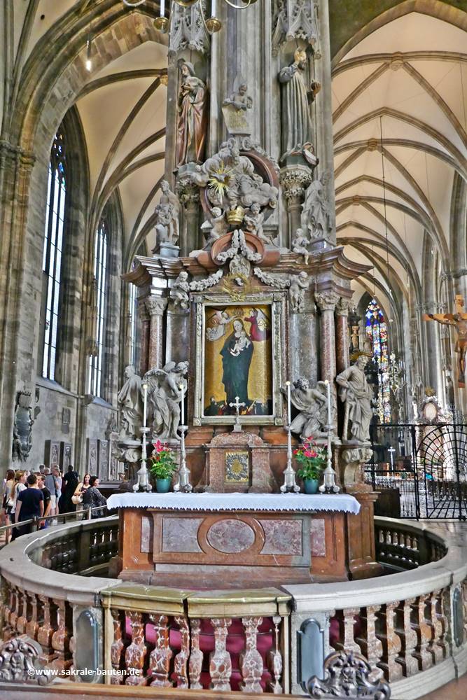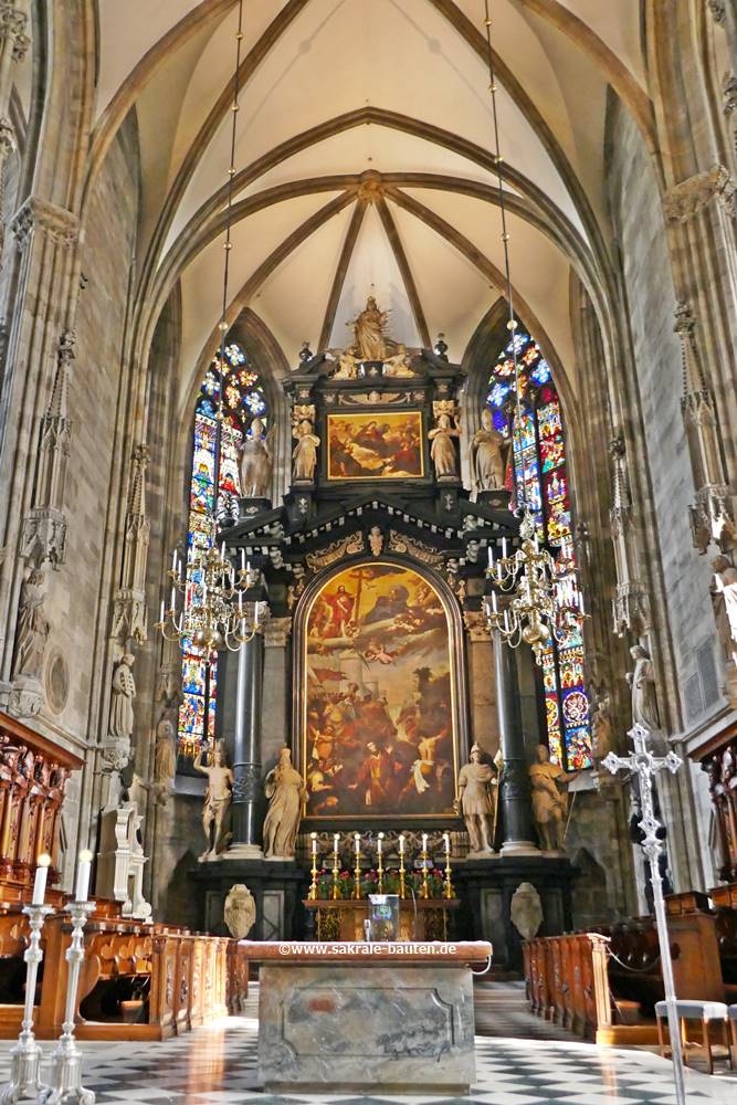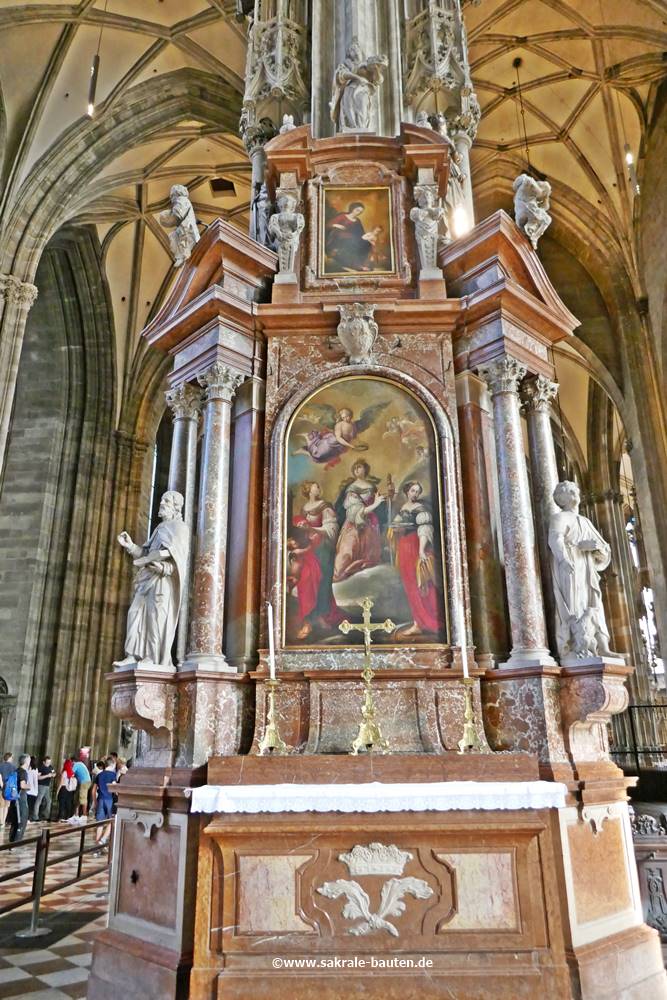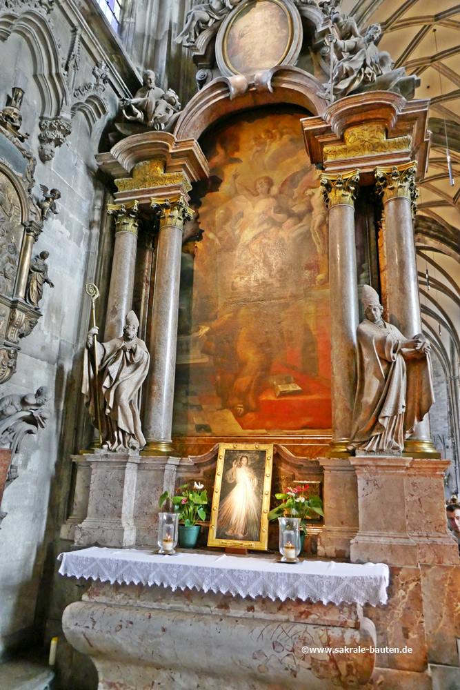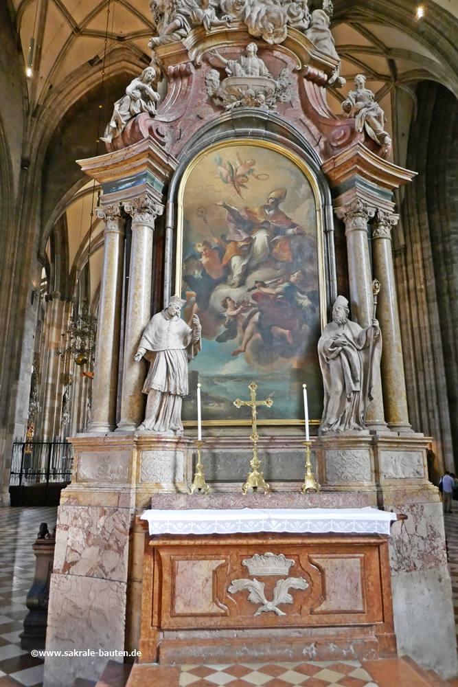 ist daher ein Porta-Coelis (Himmelspforten-) Altar. Thema ist die Steinigung des Heiligen Stephan, des Namenspatrons des Doms. Bekrönt wird der Altar von einer Statue der Immaculata.