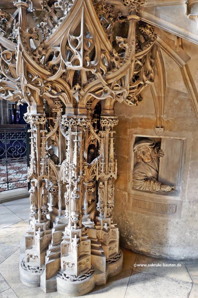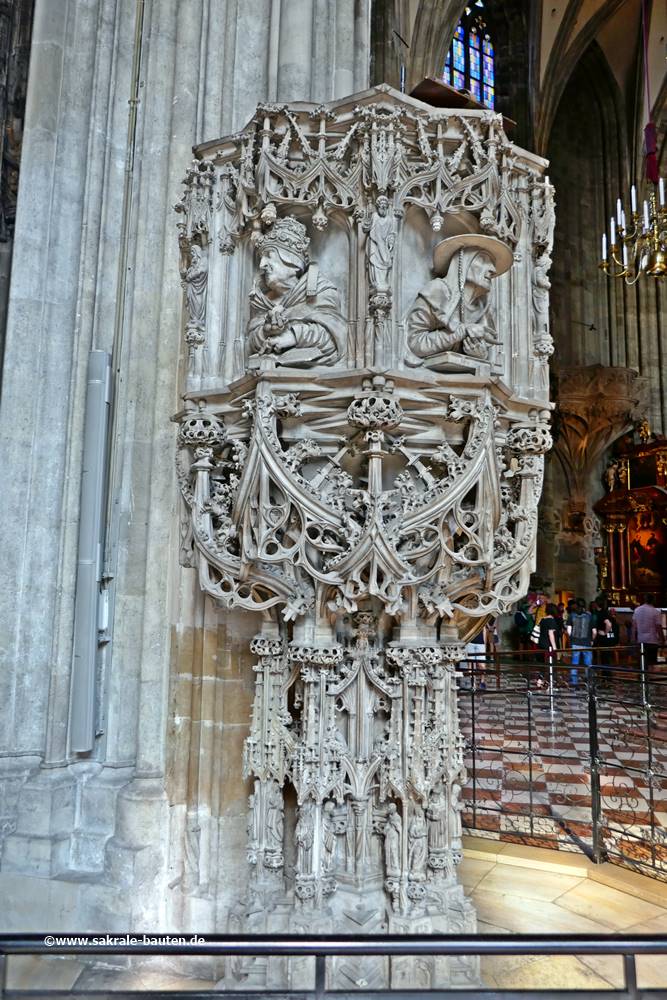 Bild 3: Die Capistrankanzel ist eine kleine gotische Kanzel aus Sandstein, die sich außen an der Ecke des Nordchors des Stephansdoms befindet.