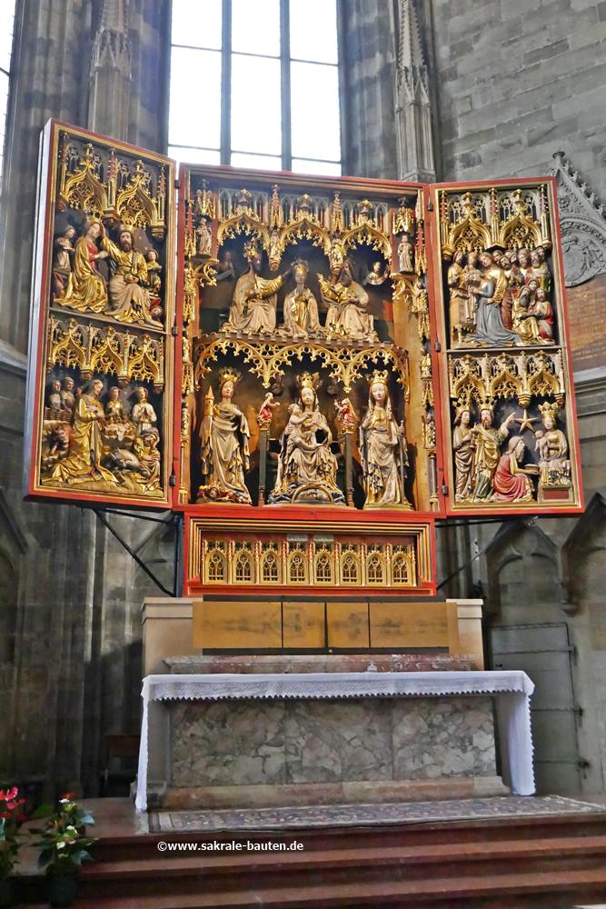 ist ein vierflügeliger Wandelaltar, an dem sehr deutlich die Herkunft des Flügelaltares aus dem Reliquienschrank zu erkennen ist.