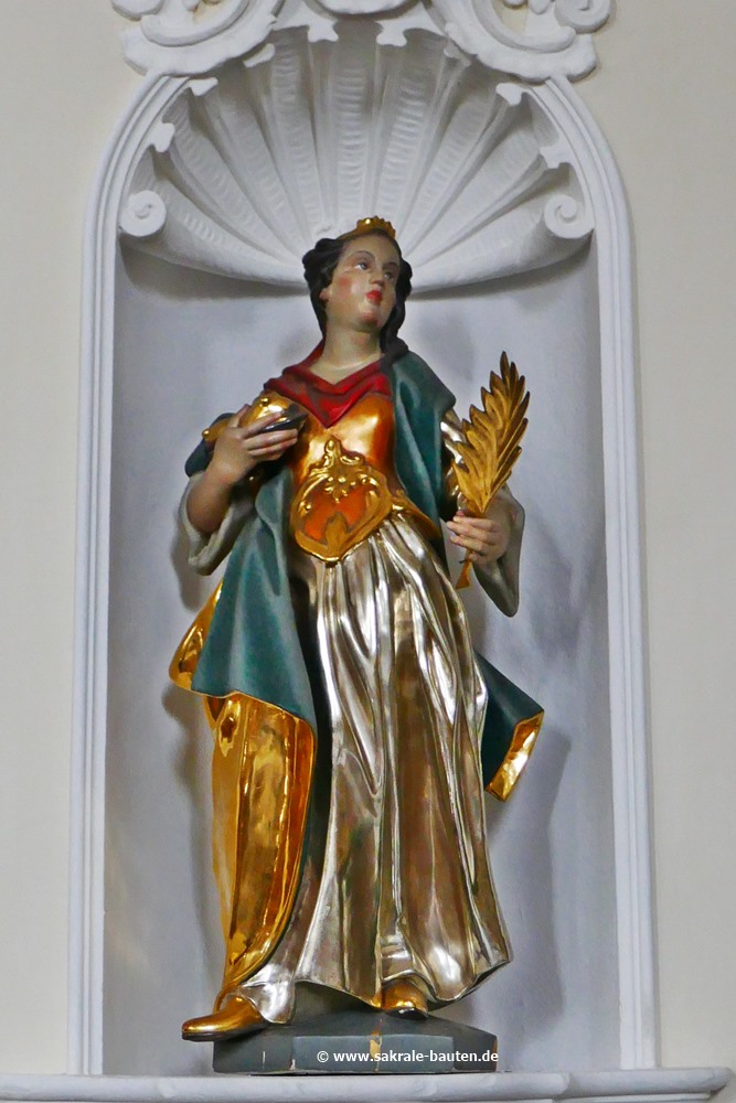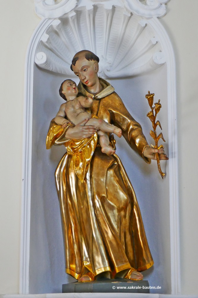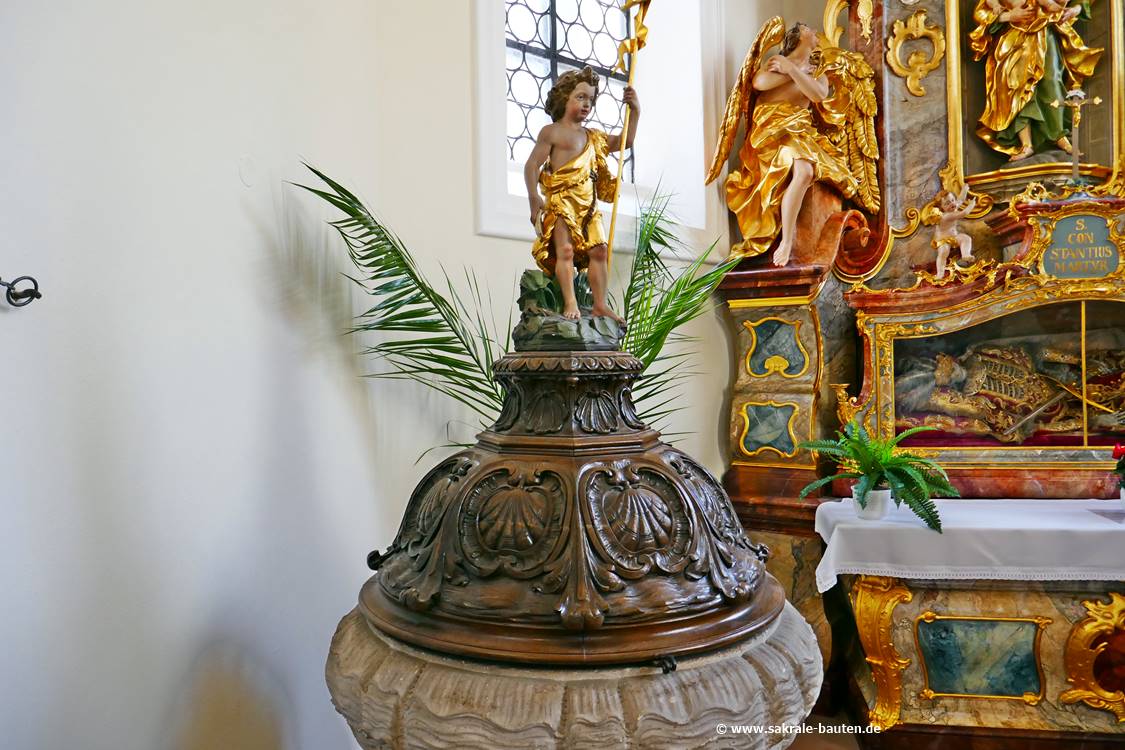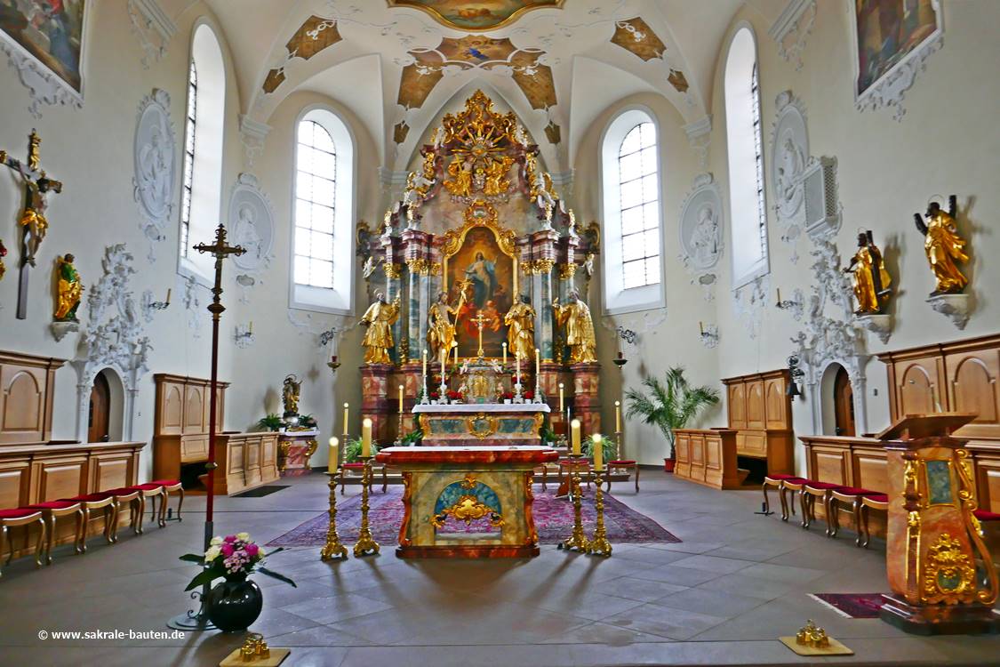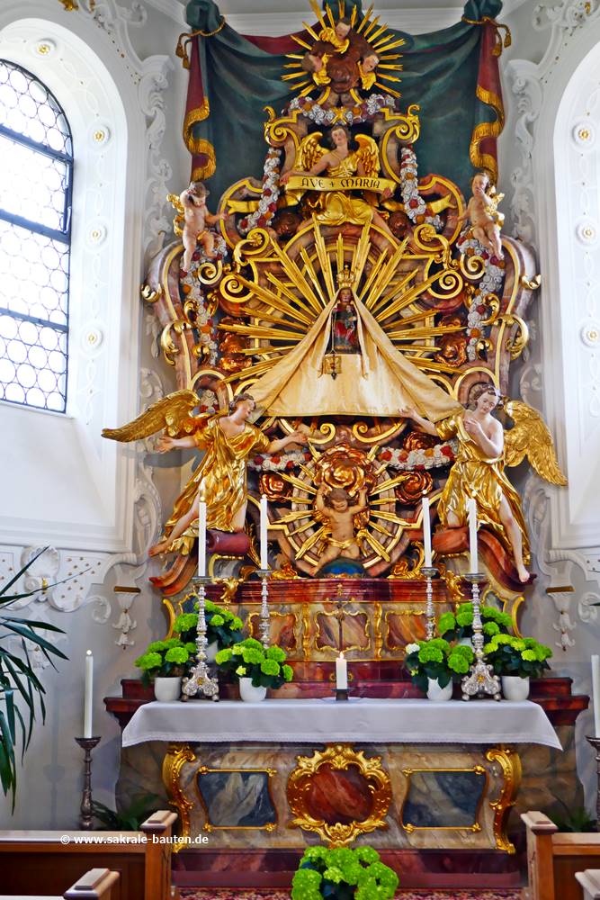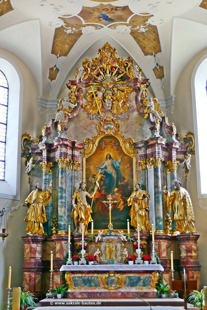 Als neues Hochaltarbild malte Martin von Feuerstein die „Himmelfahrt Mariä“. Von Fallers geretteten lebensgroßen Figuren stellt die linke den heiligen Bischof