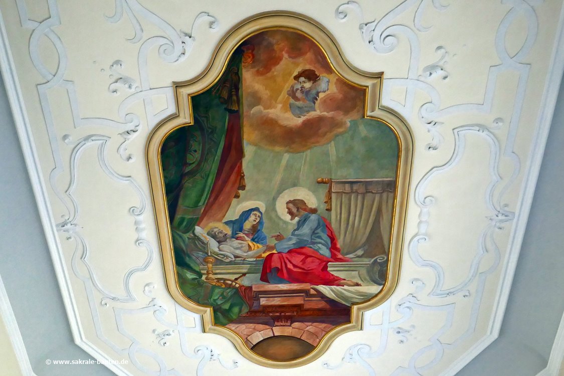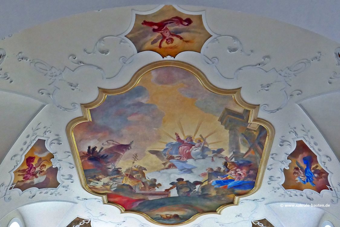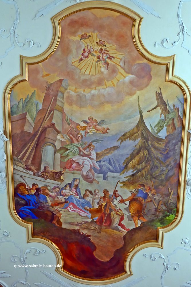 Die Deckenbilder malte nach 1907 Waldemar Kolmsperger der Ältere (1858–1943) aus Berchtesgaden.