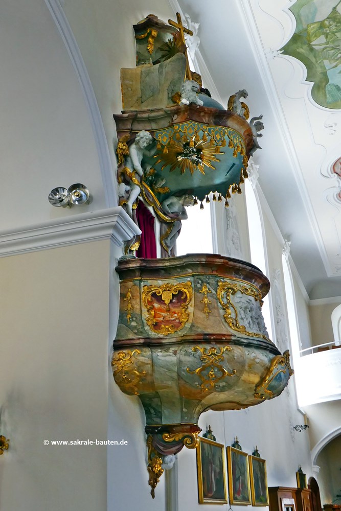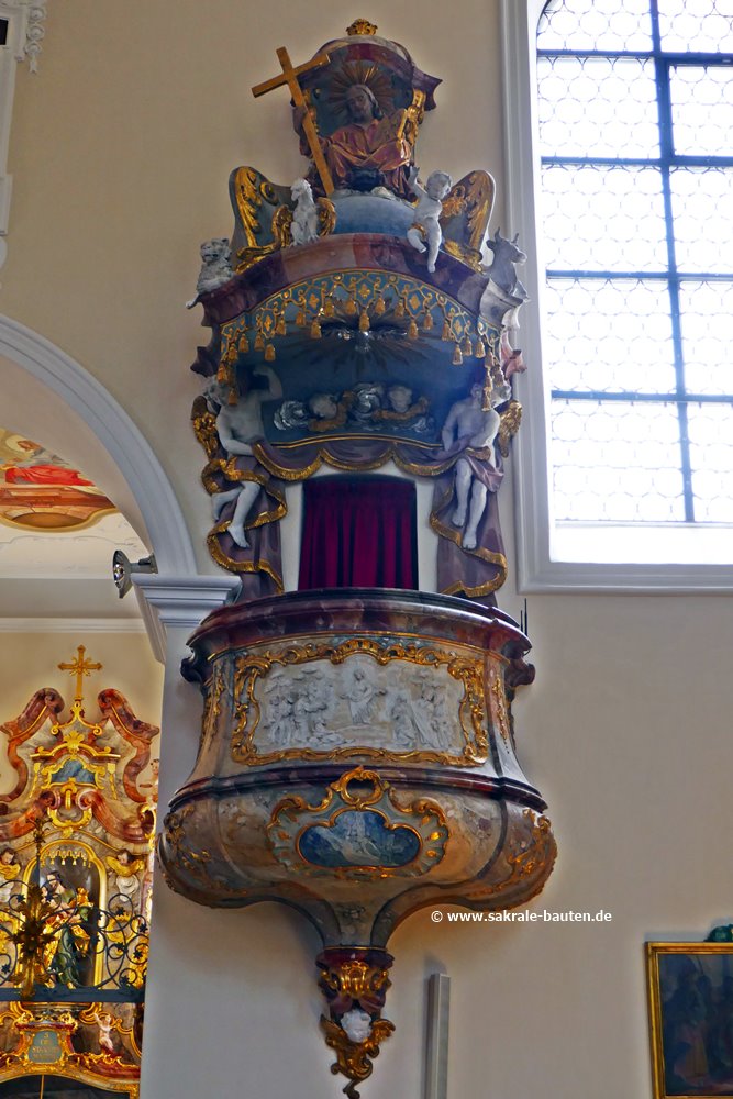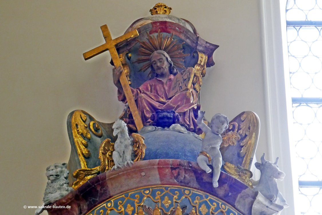 Auf dem Kanzeldeckel sitzt über den vier Evangelistensymbolen der mit Gesetzestafeln und Kreuz lehrende Christus auf einem Thron.
