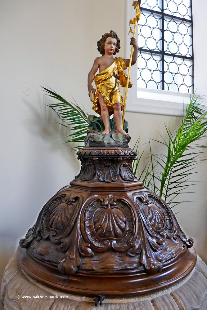 Die zweite von links ist der heilige Johannes der Täufer, der mit der rechten Hand auf Jesus im Tabernakel weist.