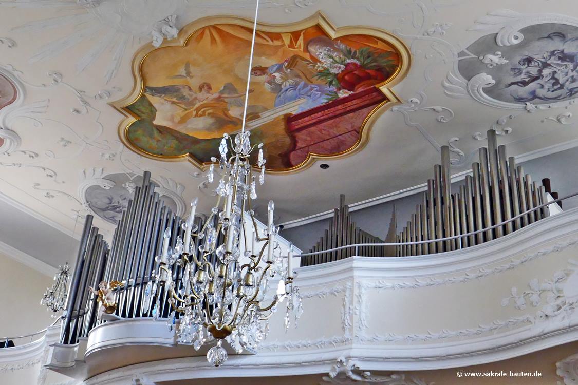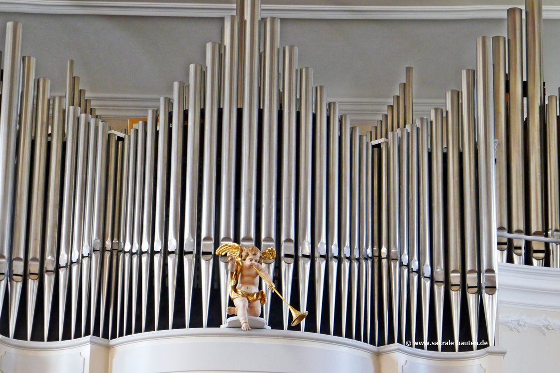 Über der Orgelempore ist in der Rückschau die bei Lukas beschriebene Ankündigung der Geburt Christi durch den Erzengel Gabriel bewegt inszeniert.