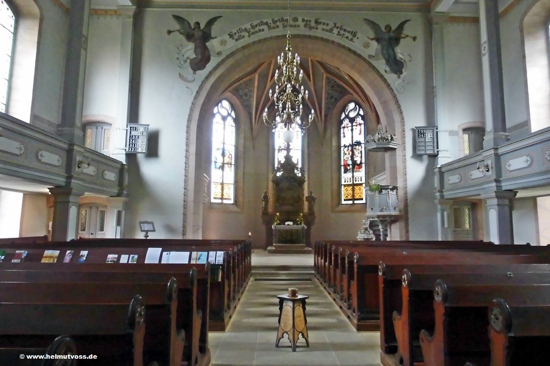 Die Wandmalerei über dem Chor aus dem Jahre 1898. Der barocke Altar aus Cottaer Sandstein aus dem Jahre 1770.