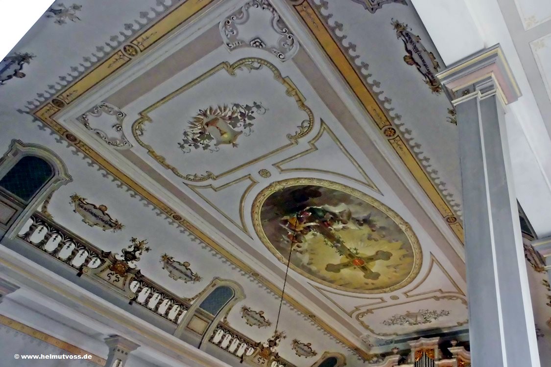Das Deckengemälde von Reinboth. An der Decke des Kirchenschiffes der Stadtkirche befindet sich ein großes Gemälde mit Symbolen des christlichen Glaubens.