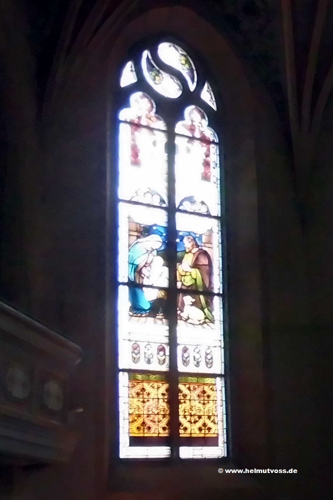 Bild 1: Fenster Weihnachtsbild im Chorraum. Es ist die bildliche Darstellung aus der biblischen Weihnachtsgeschichte.