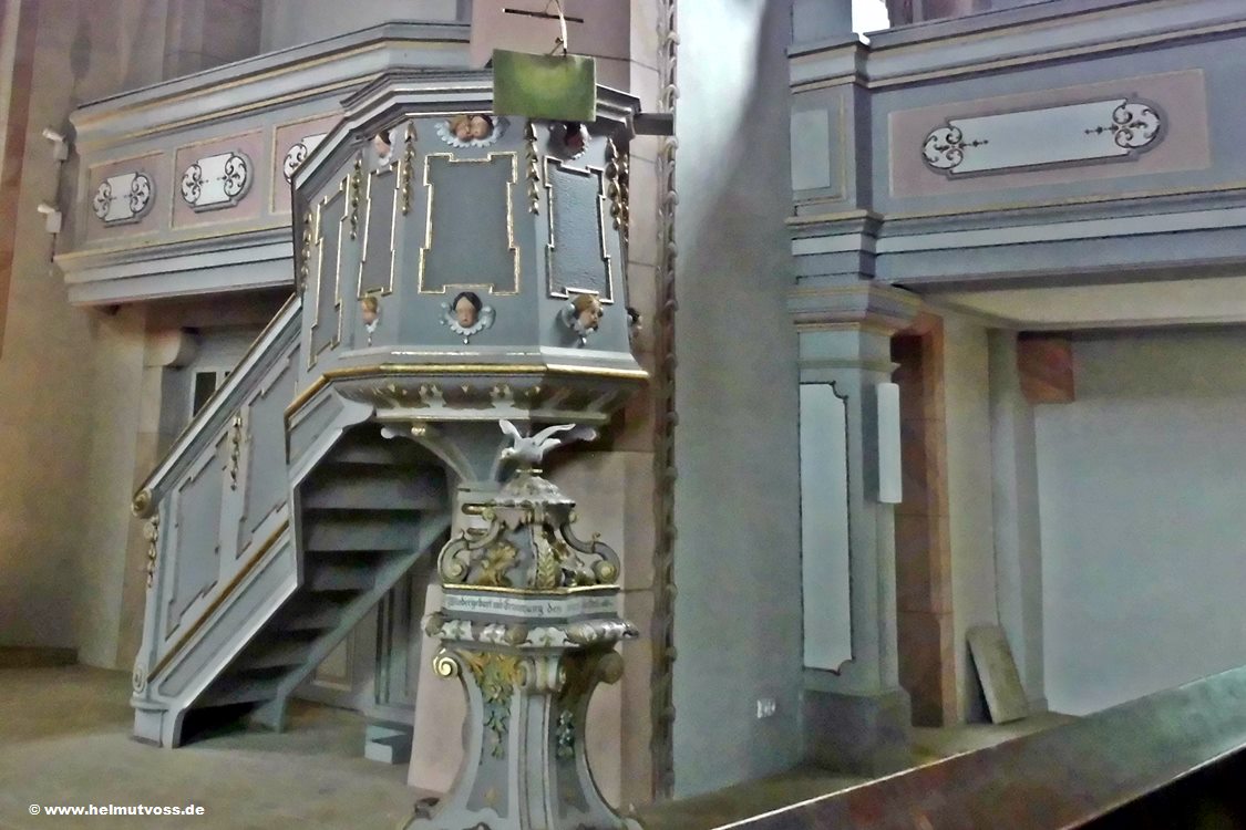 Die Barocke Holzkanzel, davor die Holztaufe aus denm Jahr 1727.