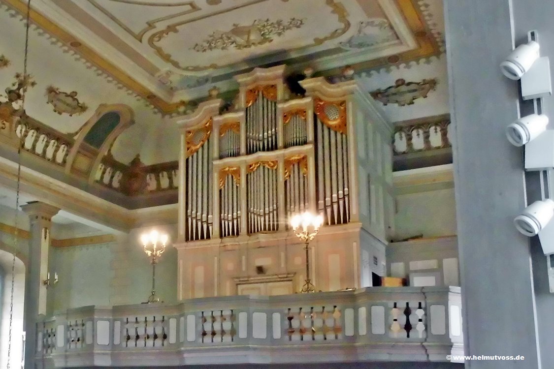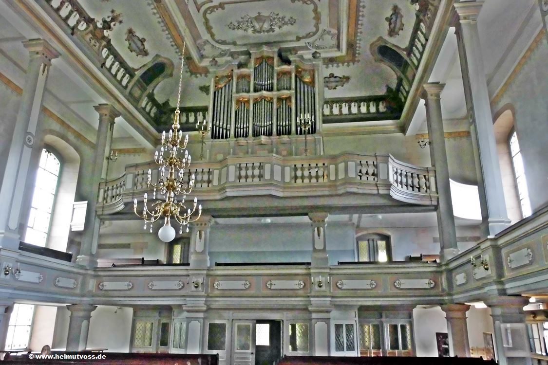 Auf der Empore das barockes Gehäuse der Johann Christian Pfennig-Orgel von 1766. Orgel von Hermann Eule, Bautzen (1898). Die Anzahl der Manuale 2, Pedal 1