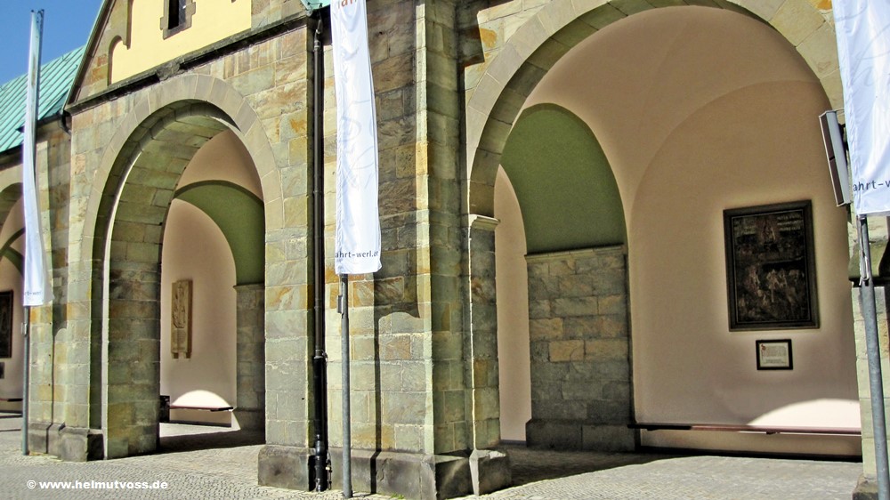 Am Aufgang zur Kirche eine Wandelhalle, die sich mit Arkaden nach dem von ihr allseitig umschlossenen Basilikahof öffnet.