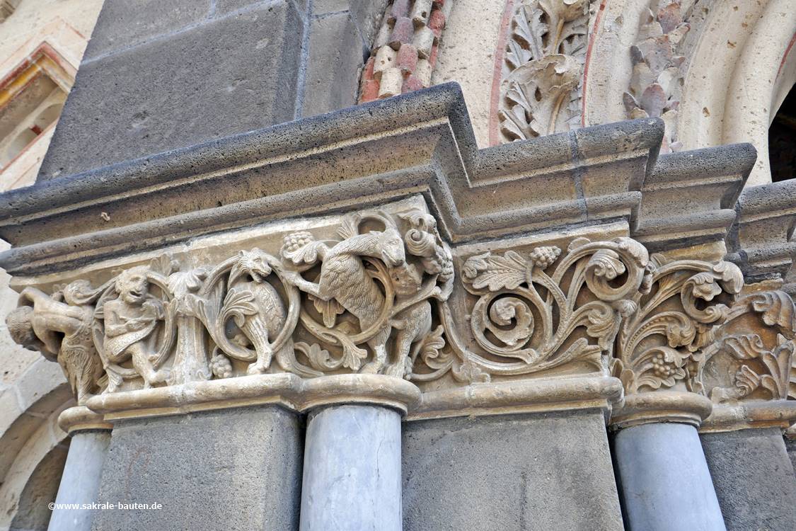 an den Arkaden finden sich wunderschöne feingliedrige Kapitellplastiken, die alte Menschheitsmotive von Kampf und Streit, Neid und Missgunst zeigen.