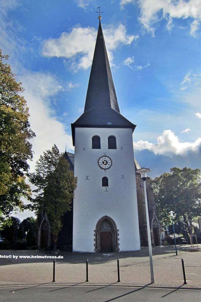 Die Sankt Petri Kirche in Hüsten im Sauerland an der Ruhr, der markante Turm, sichtbar das Wahrzeichen des kleinen Städtchens.