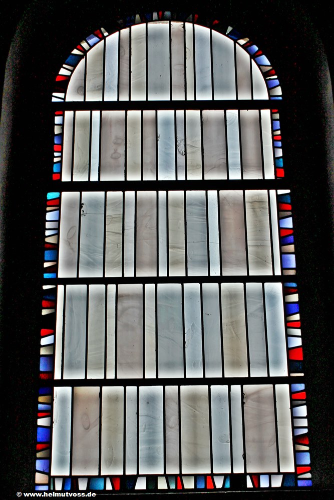 Bild 1+3: Fenster im Schiff, Ornament von Karl Hellwig, 1964. Bild 2: Fenster im Chor, Christus Pantokrator. Signatur: Entwurf von: Max Schulze-Sölde, um 1930.