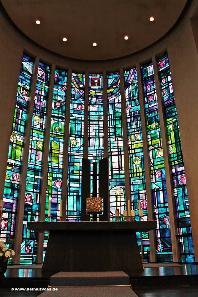 Die große Fensterfläche der Apsis hüllt den Chorraum in ein bestimmendes , ruhiges Leuchten ein.