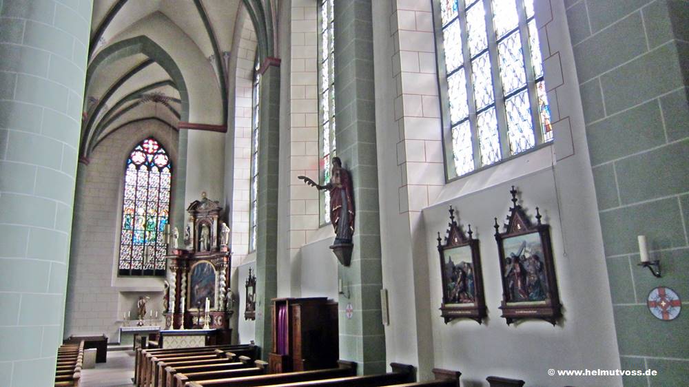 Der dreischiffige gotische Hallenbau im Chor die Apostelfiguren.