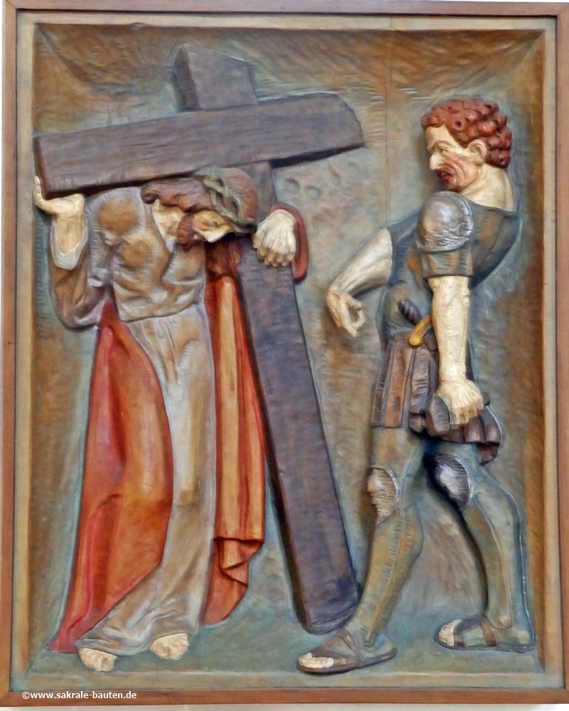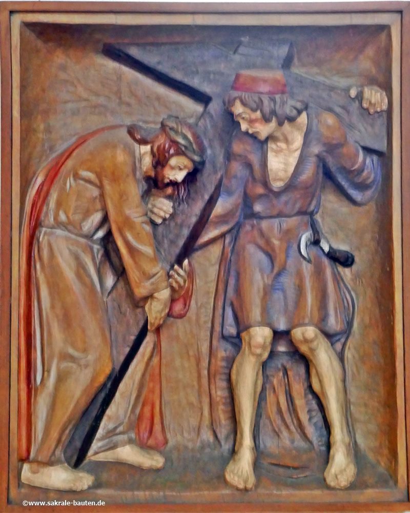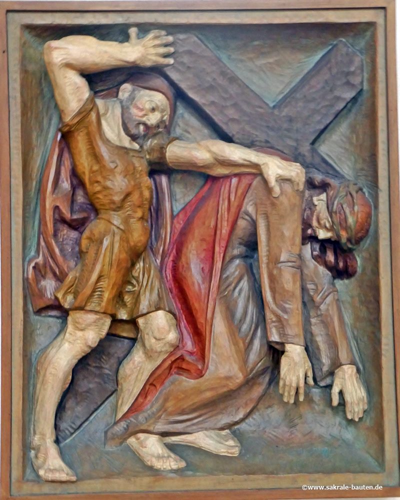 Die fünfte Station zeigt einen Mann, der Jesus das Kreuz trägt. Die Bibel kennt auch seinen Namen: Simon von Cyrene, der Vater des Alexander und Rufus.