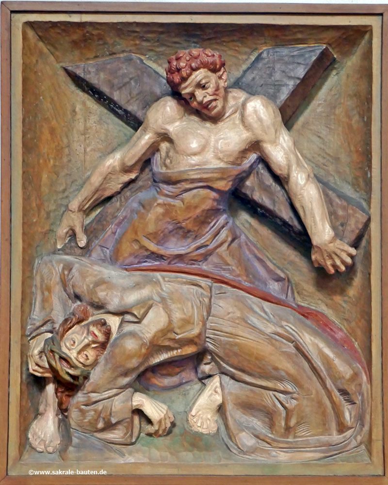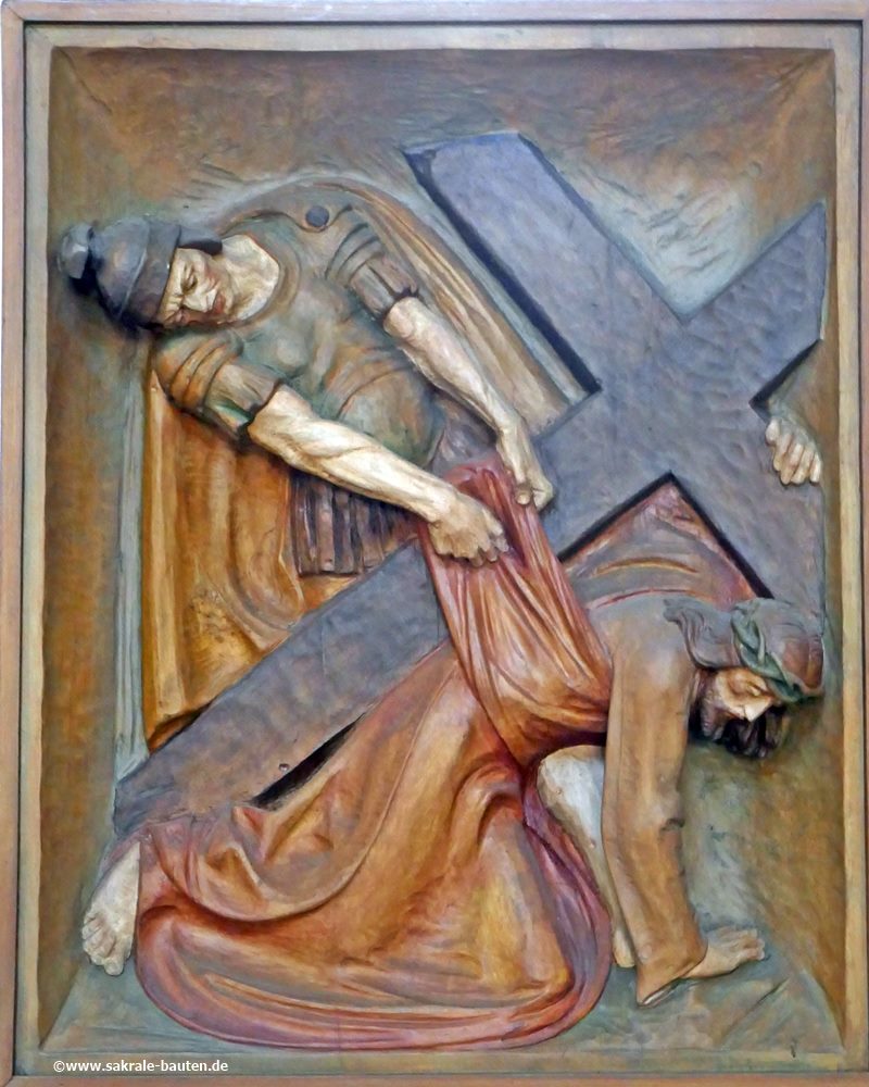 Jesus fällt unter der Last des Kreuzes. Im biblischen Ablauf der Leidensgeschichte Jesu gibt es diese Szene nicht.