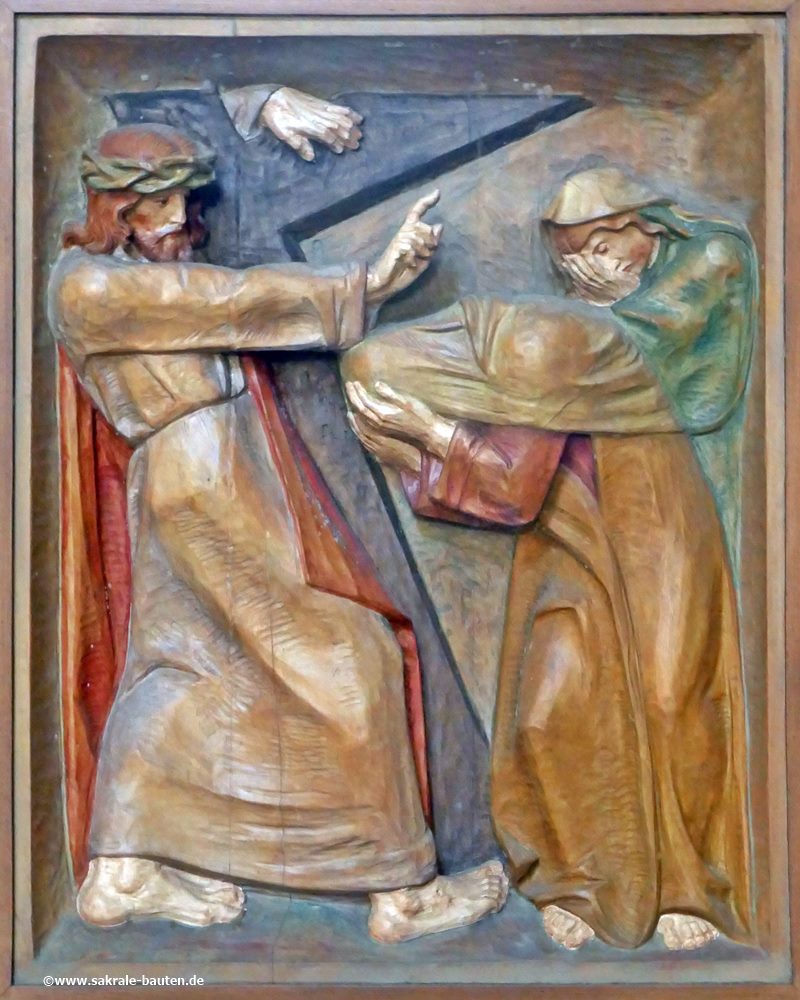 Jesus das Kreuz nachzutragen, findet sich folgender Text: Es folgte eine große Menschenmenge, darunter auch Frauen, die um ihn klagten und weinten. Jesus wandte sich zu ihnen um und sagte: