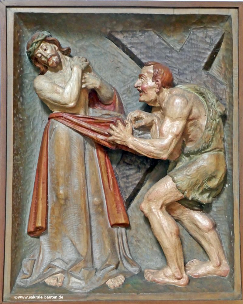 dass nach der Kreuzigung Jesu seine Kleidungsstücke per Losentscheid aufgeteilt wurden. Die Kreuzwegstation rückt den Moment in den Blick, da Jesus entkleidet wird.