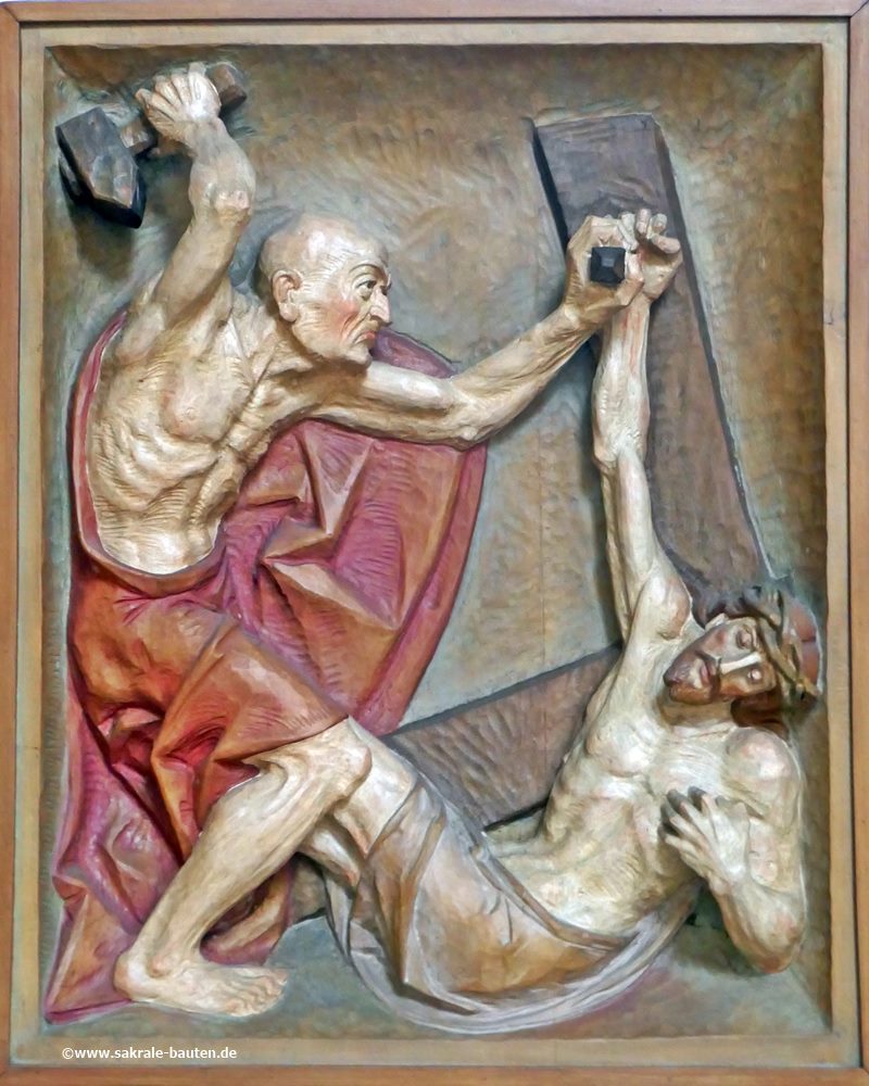 dass die Hände und Füße Jesu mit Nägeln am Holz des Kreuzes befestigt wurden. Es geht hier nicht um historische Genauigkeit, hier soll die Aufmerksamkeit des Betrachters gebunden werden.