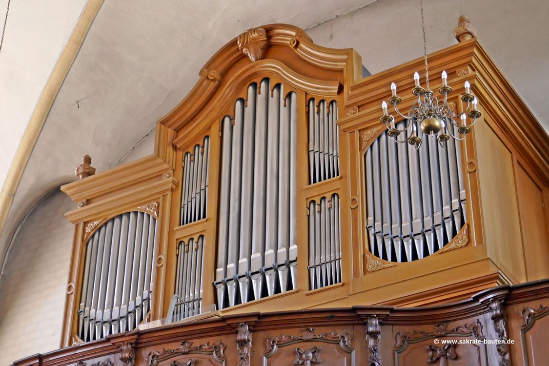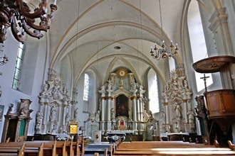 Bild 2: Rechts ist am dritten Langhauspilaster die schöne Rokokokanzel.