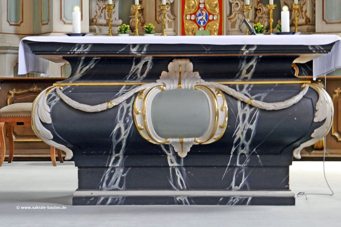 Im Giebelfeld des Hochaltars über dem Bild ist eine Figur des Namenspatrons der Kirche, des hl. Nikolaus angebracht.