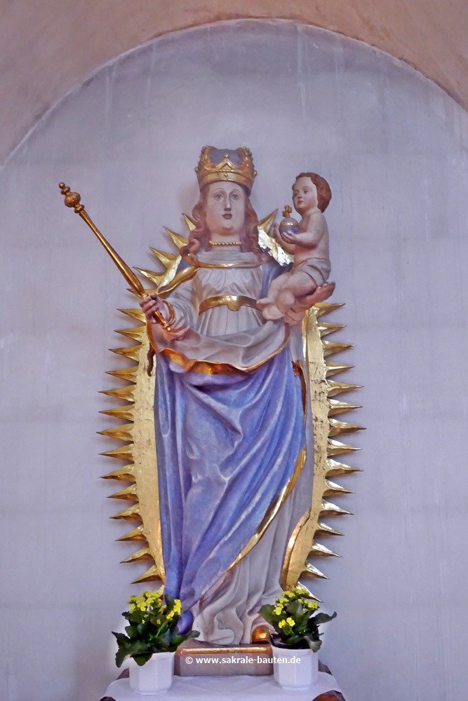 Links außen steht St. Josef mit dem Jesukind, rechts außen St. Johannes Nepomuk. Zentral über der Madonna im Gesims ist das Wappen der Stifterin,
