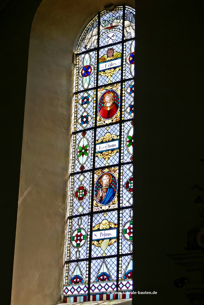 Unterhalb des Chores waren in einem Keller acht Sargkammern eingerichtet. Der Tabernakel im Altarraum seitlich auf einer Stele.