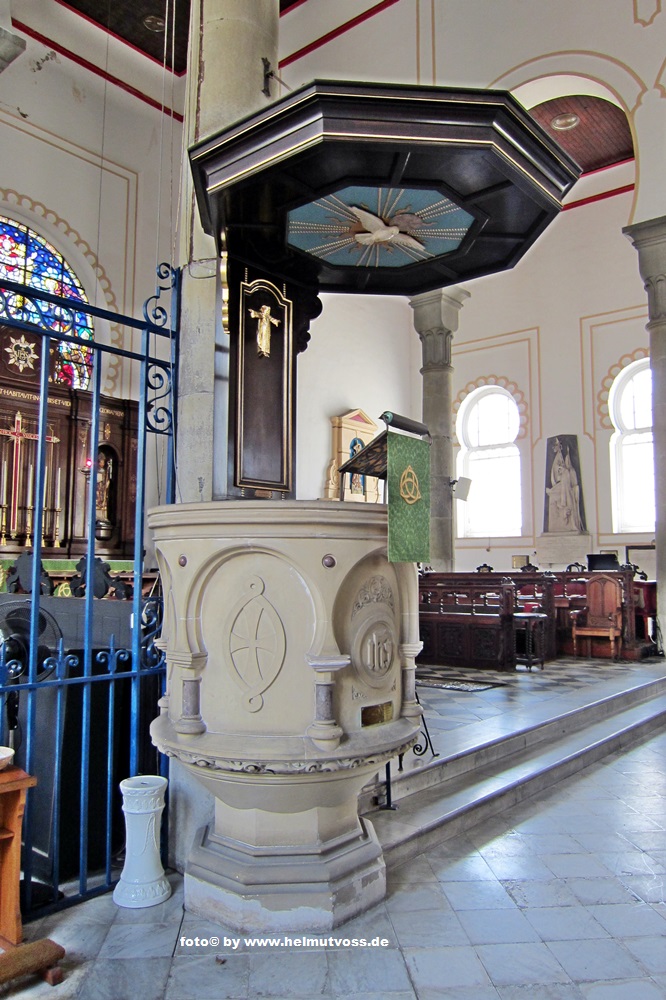 Vor dem Altar ist ein vergoldetes Heiligenbild im Boden eingelassen. Der Altar mit schlichtem Kreuz und zwei Heiligenfiguren.