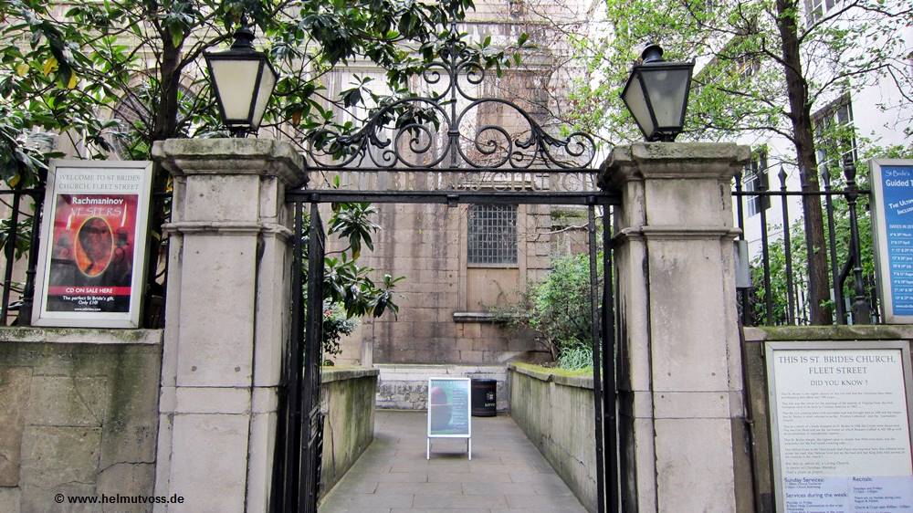 Von der Fleet Street aus betreten, gegen 14:00 Uhr die St. Brides-Kirche. Wir sind überrascht, bemerken sofort zwei Dinge: